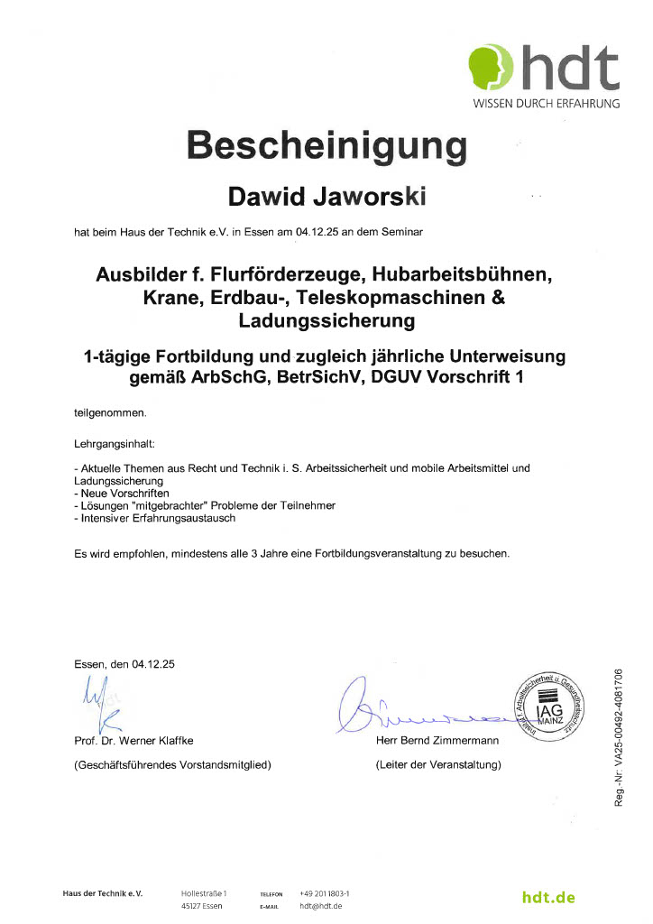 Mein Name ist Dawid Jaworski. Ich bin Ausbilder für Staplerfahrer, Kranführer, Hubarbeitsbühnenbediener und Ladungssicherung. Schön, dass Sie auf meine Seite gefunden haben. Ich hoffe, Sie finden alles, was Sie brauchen. Zu meiner Person: ich bin 41 Jahre alt und wohne in Attendorn im Sauerland. Ich bin verheiratet, habe einen Sohn und eine Havaneser-Hündin. Meine Freizeit widme ich meiner Leidenschaft, dem Fußball, sowohl in der Heimat als auch Bundesliga. Ich freue mich auf Ihre Anfrage!